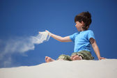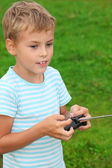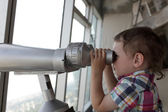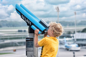 mały chłopiec stojący w pobliżu lornetki i patrząc na odległość