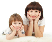 dziewczynka i jej matka leży na biały spadła, ręce na podbródek, loo