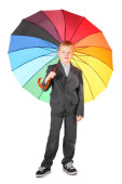 piękna młoda kobieta w żółta koszulka z st wielobarwny parasol