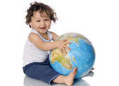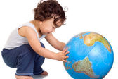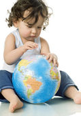 dziewczynka siedzi w pobliżu duży nadmuchiwany Globus i trzymając go, lo