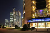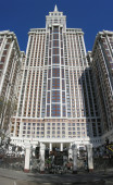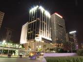 Dubai - 18 kwietnia: Emirates Towers i obszar z palmy i trawy
