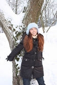Młoda piękna dziewczyna stoi i wprowadzenie ręce, odkryty w wint