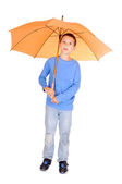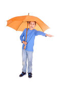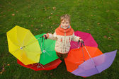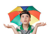 mały chłopiec w czerwonej koszuli z stojący duży parasol wielobarwny
