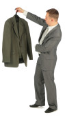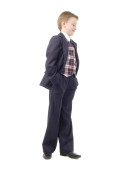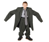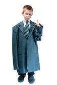 Mały chłopiec w wielki szary człowiek w garnitur i buty patrząc na podłodze iso