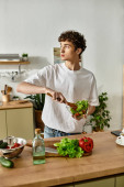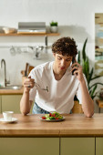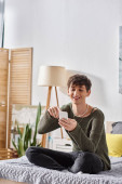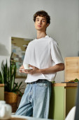 Zdjęcie "Młody mężczyzna z kręconymi włosami uśmiecha się w nowoczesnym mieszkaniu, trzymając telefon i laptopa." może być wykorzystywane do celów osobistych i komercyjnych zgodnie z warunkami zakupionej licencji Royalty-free. Obraz jest dostępny do pobrania w jakości wysokiej rozdzielczości do 5760x3840.