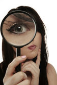 Zdjęcie "Dziewczyna trzyma na oko szkło powiększające" może być wykorzystywane do celów osobistych i komercyjnych zgodnie z warunkami zakupionej licencji Royalty-free. Obraz jest dostępny do pobrania w jakości wysokiej rozdzielczości do 5760x3840.