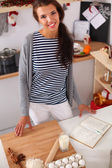Young beautiful wife woman cook chef baker with fresh batch of cupcakes portrait home sweet homemade
