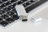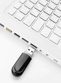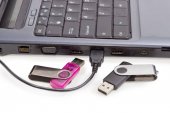dwa dyski na klawiaturze laptopa i jeden błysk podłączony do portu usb flash