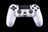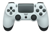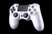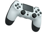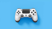 Realistyczny biały joystick gry wideo lub gamepad na fioletowym tle. 3D renderowanie strumieniowe sprzętu do gier w chmurze i koncepcji obszaru roboczego gracza