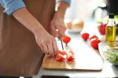 Kobieta jest gotowanie w kuchni (krojenie warzyw )