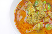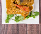 Widok z góry, wieprzowina curry mussaman na drewno