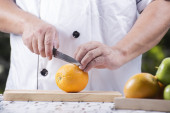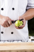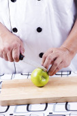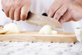 szef kuchni cięcia ziemniaków na drewniane szeroko