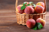 Świeżych brzoskwiń w wiklinowym koszu na drewniane tła