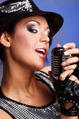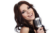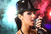 Portret efektownej dziewczyny z piosenką śpiewającą mikrofon