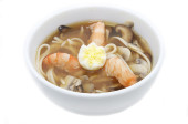 Morza krewetki z warzyw i chińskim makaronem żółty: pyszne jedzenie Chiny