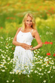 Portret pięknej młodej kobiety blondynka w białej sukni na