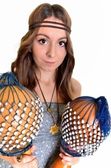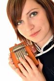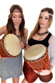 ładna dziewczyna gra na perkusji lub tom tomy z jej rąk