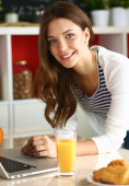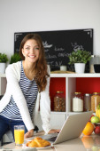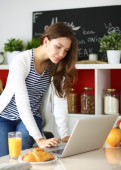atrakcyjna młoda kobieta za pomocą laptopa i siedzi w kuchni