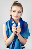 Zdjęcie "Uśmiechnięta młoda kobieta gospodarstwa pędzle do makijażu. Portret pięknej kobiety z pędzle do makijażu w pobliżu atrakcyjna twarz. Szminka dziewczyna. " może być wykorzystywane do celów osobistych i komercyjnych zgodnie z warunkami zakupionej licencji Royalty-free. Obraz jest dostępny do pobrania w jakości wysokiej rozdzielczości do 5760x3840.