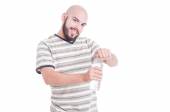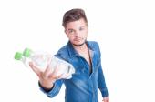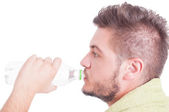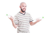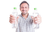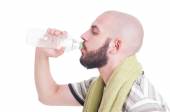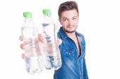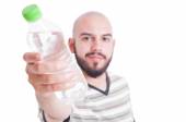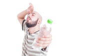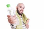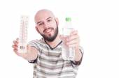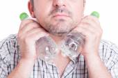 Mężczyzna, trzymając butelkę zimnej wody i pokazano jak gest