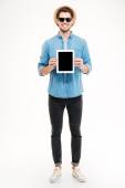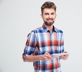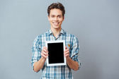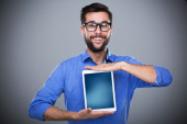 Człowiek, wskazując palcem na ekranie komputera puste tabletka