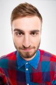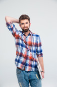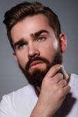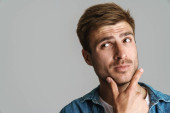 Portret szczęśliwy człowiek dotykając jego podbródek