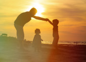 Ojciec z sylwetki dzieci zabawy na zachodzie słońca