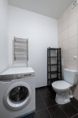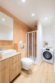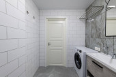 Zdjęcie "Jasne i nowoczesne wnętrze umywalni prezentujące pralkę, eleganckie drewniane panele i nieskazitelne białe elementy, odpowiednie dla nowoczesnych przestrzeni mieszkalnych." może być wykorzystywane do celów osobistych i komercyjnych zgodnie z warunkami zakupionej licencji Royalty-free. Obraz jest dostępny do pobrania w jakości wysokiej rozdzielczości do 5760x3840.