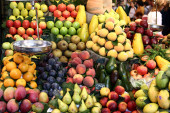 La boqueria, owoce. świat słynnego targu barcelona, Hiszpania. Selec