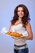 Kelnerzy prowadzenie trzymać płyty z mięsem na niebieskim tle