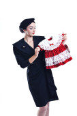 szałowy retro kobieta z torba podróżna na białym tle