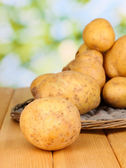 Obrane ziemniaki nowy w misce na drewnianym stole z serwetka, zbliżenie