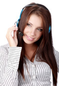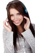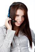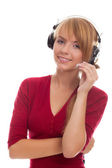 piękne klienta z zestawu słuchawkowego uśmiechający się podczas