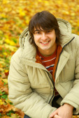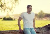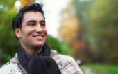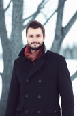 Portret przystojny brodaty mężczyzna ubrany w czarny płaszcz jesień