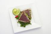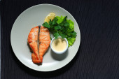 Bliska smażone łososia ze szpinakiem, gotowane ziemniaki i krem