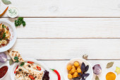 Tabela serwowane z Bliskiego Wschodu wegetariańskimi. Hummus, tahi