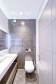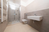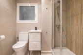 Zdjęcie "Przytulna, ale wyrafinowana łazienka z beżowymi płytkami, miękkim oświetleniem, pływającą próżnością i eleganckim prysznicem." może być wykorzystywane do celów osobistych i komercyjnych zgodnie z warunkami zakupionej licencji Royalty-free. Obraz jest dostępny do pobrania w jakości wysokiej rozdzielczości do 5760x3840.