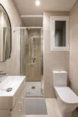 Przytulna, ale wyrafinowana łazienka z beżowymi płytkami, miękkim oświetleniem, pływającą próżnością i eleganckim prysznicem.