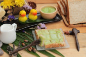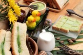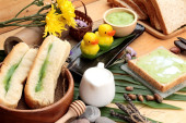 Zdjęcie "Chleb z zielony krem i świeżego mleka." może być wykorzystywane do celów osobistych i komercyjnych zgodnie z warunkami zakupionej licencji Royalty-free. Obraz jest dostępny do pobrania w jakości wysokiej rozdzielczości do 5760x3840.