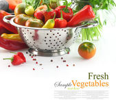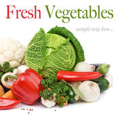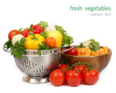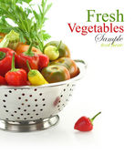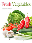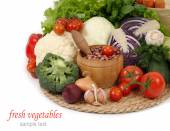 Świeże warzywa dojrzałe w drewniane pudełko na białym tle z miejscem na tekst.