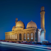 Meczet Bibi-Heybat w Baku, Azerbejdżan, na tle błękitnego nieba, z charakterystycznymi minaretami, kopułami i skomplikowaną fasadą