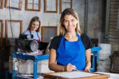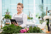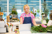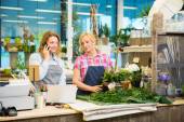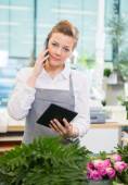 Kobiece kwiaciarni przy użyciu telefonu komórkowego w kwiaciarni