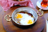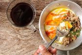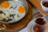 Śniadanie z jajkiem sadzonym na patelni i gorącej kawy