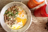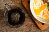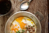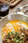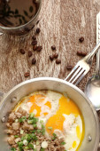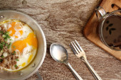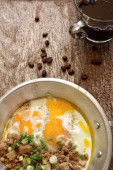Śniadanie z jajkiem sadzonym na patelni i gorącej kawy