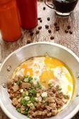 Śniadanie z jajkiem sadzonym na patelni i gorącej kawy