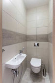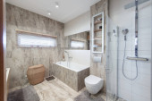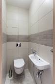 Zdjęcie "Jasne i stylowe wnętrze łazienki z przeszkloną kabiną prysznicową, białym ceramicznym wyposażeniem, eleganckim zlewem i toaletą na ścianie" może być wykorzystywane do celów osobistych i komercyjnych zgodnie z warunkami zakupionej licencji Royalty-free. Obraz jest dostępny do pobrania w jakości wysokiej rozdzielczości do 5760x3840.