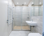 Jasne i stylowe wnętrze łazienki z przeszkloną kabiną prysznicową, białym ceramicznym wyposażeniem, eleganckim zlewem i toaletą na ścianie