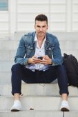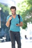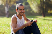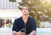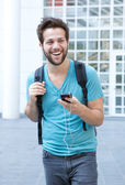 Człowiek szczęśliwy słuchania słuchawki i telefon komórkowy
