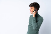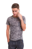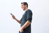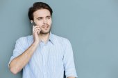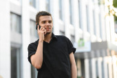 uśmiechnięty mężczyzna chodzący i mówiący przez komórkę