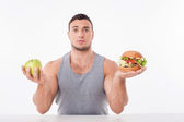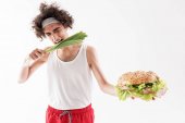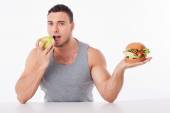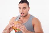 Attractive young man is eating unhealthy hamburger